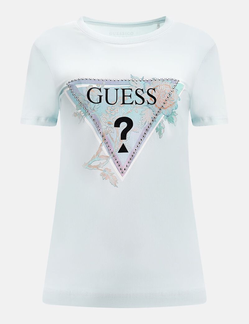 - Cotton blend t-shirt. Crew neck. Short sleeves. Slim fit. FABRIC TYPE: Jersey. EMBELLISHMENTS: Front triangle logo. Picture shows size S. Total length: 23.62 inch. / 60 cm. True to size. SHELL (main fabric): 95% Cotton, 5% Elastane